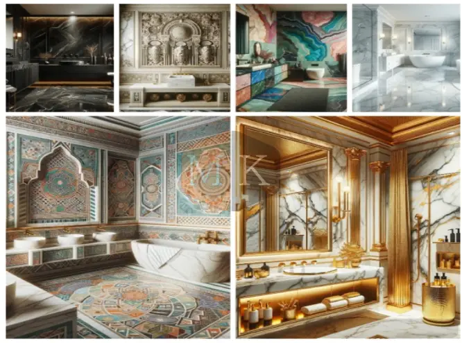 حمام بالرخام الملون: حمام مزين بالرخام الملون، مما يضيف لمسة من الألوان الجميلة إلى المساحة. اختر من بين مجموعة متنوعة من الرخام الملون مثل الأخضر الداكن والأزرق والوردي والأسود الداكن لإضفاء جمالية فريدة على حمامك. تتميز الجدران والأرضيات بهذا الرخام النابض بالحياة، مما يخلق جوًا أنيقًا وحيويًا يعزز سحر الحمام وتطوره بشكل عام.